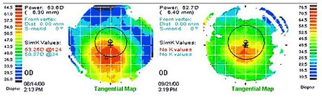 To treat routine nearsightness, two Intacs™ are placed within the cornea to flatten the curvature of the cornea and decrease the need for glasses or contact lenses. The Intacs™ are placed within the cornea in an office surgical suite, using eye drops to numb the eye. When used for Keratoconus, one or two Intacs™ are used to flatten the corneal cone. The area of the cone can be quite thin in Keratoconus, but the Intacs™ are placed outside the cone, where the cornea is thicker. The difference in the steepness of the cone can be seen in the topography maps shown below. Prior to implantation of the Intacs™, the cone can be seen as an off-center red area. After the Intacs™ have flattened the cone, the astigmatism is seen as a smaller, more centered spot on the topography map (see figure 1). Healing time is gradual, often taking three months to obtain the best vision. During this time, the vision improves gradually.